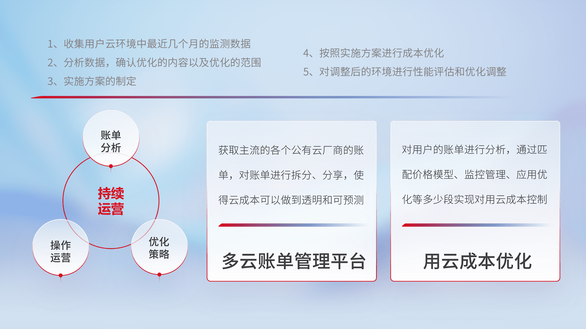 通过多云纳管,,,以统一的资源数据模型把客户的云资源进行抽象和封装,,进而实现对多云资源的统一操作,,保障云资源管理的可靠性、、、稳定性与可用性。。量身定制化运维内容,,,,配置、、开发运维、、、、补丁管理、、、备份、、、、监控、、、、认证和访问管理、、、、审计和日常巡检等,,保障在用云过程中的可靠度,,,,稳定度以及高可用率。。。